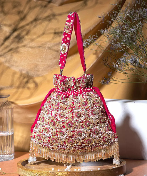 Eena potli bags are inspired by India’s rich cultural heritage but designed with a modern twist. The brand’s signature collection includes elegant shapes, vibrant colors, and stunning embellishments that suit both festive and formal occasions. Whether it’s gota work, mirror detailing, or pearl embroidery, each potli reflects luxury and fine craftsmanship.